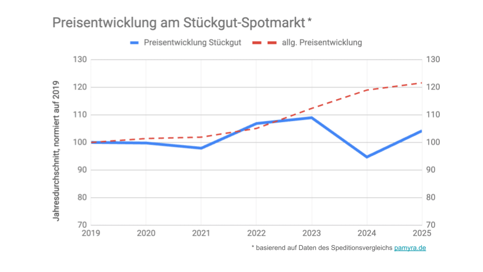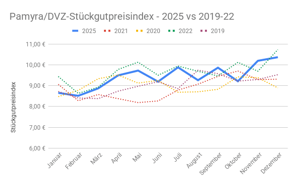 Während die offiziellen Inflationsraten zwischen 2019 und 2025 um 21,6 Prozent gestiegen sind, liegt der Pamyra/DVZ-Stückgutpreisindex im Jahresdurchschnitt 2025 lediglich rund fünf Prozent über dem Niveau von 2019. Die Preisentwicklung am Spotmarkt weicht damit deutlich vom allgemeinen Kostenanstieg ab.